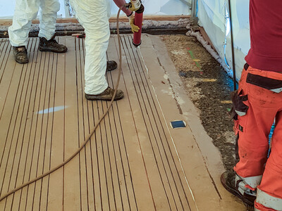 Im März 2023 folgte dann der Anschluss der Verstärkung in der Fahrspur 2. Die Beplankung der Überlappung wurde geöffnet und der Überlappungsbereich zeigte sich planmäßig in einem guten Zustand. So konnte man die CFK-Lamellen problemlos überlappend stoßen und einbauen.